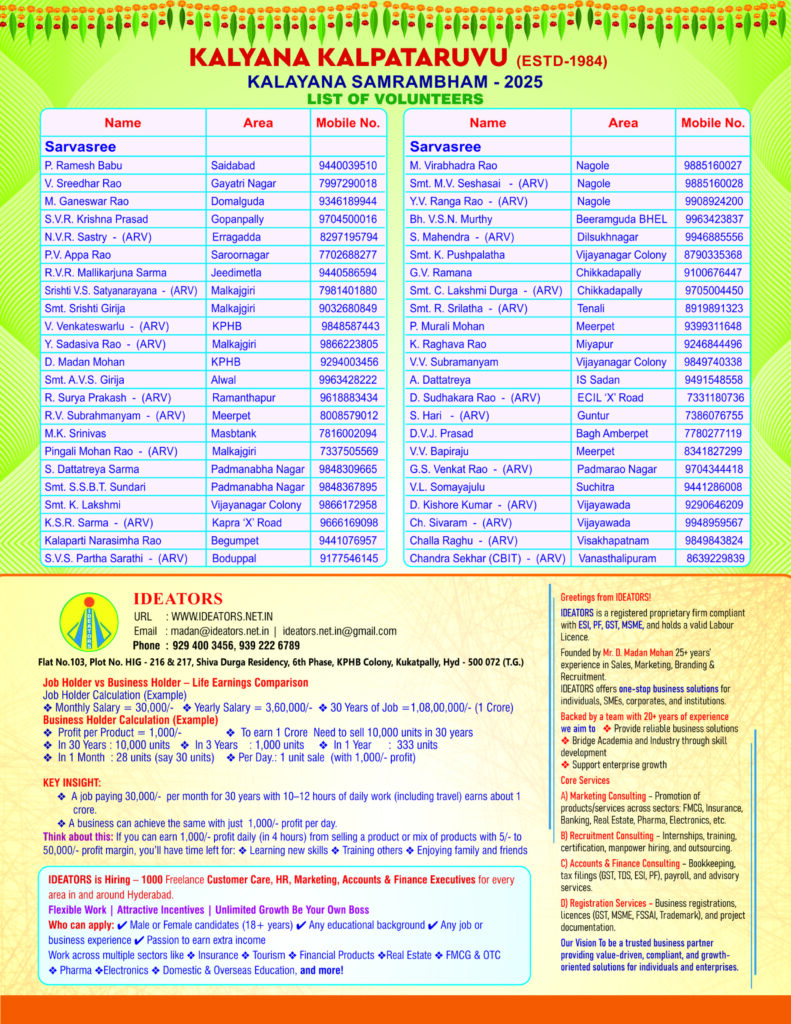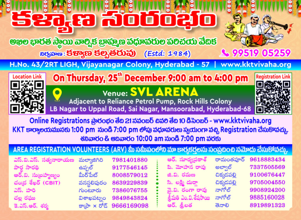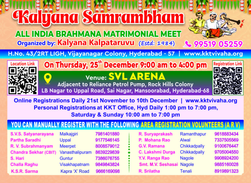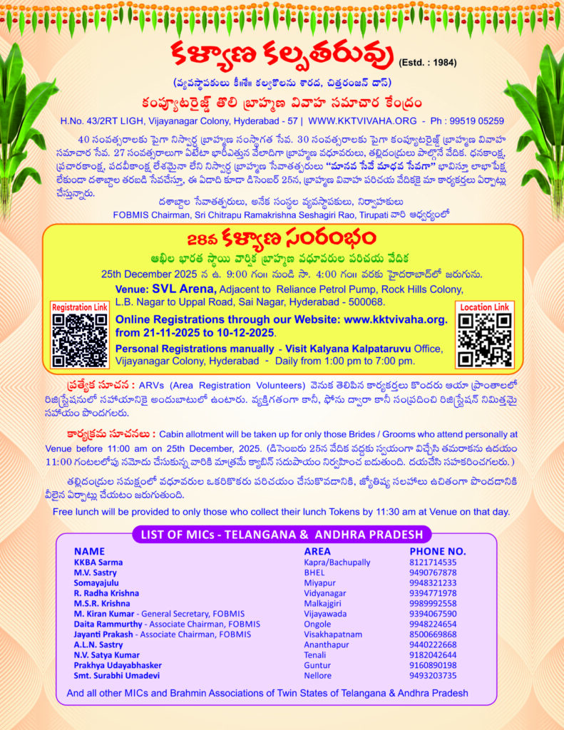 You can also send by GPay in favour of ‘Kalyana Kalpataruvu, Hyd” . Those desirous and only deserving free registrations are requested to contact our Hon chief organisation Ph 9951905259, immediately after sending bio-data.